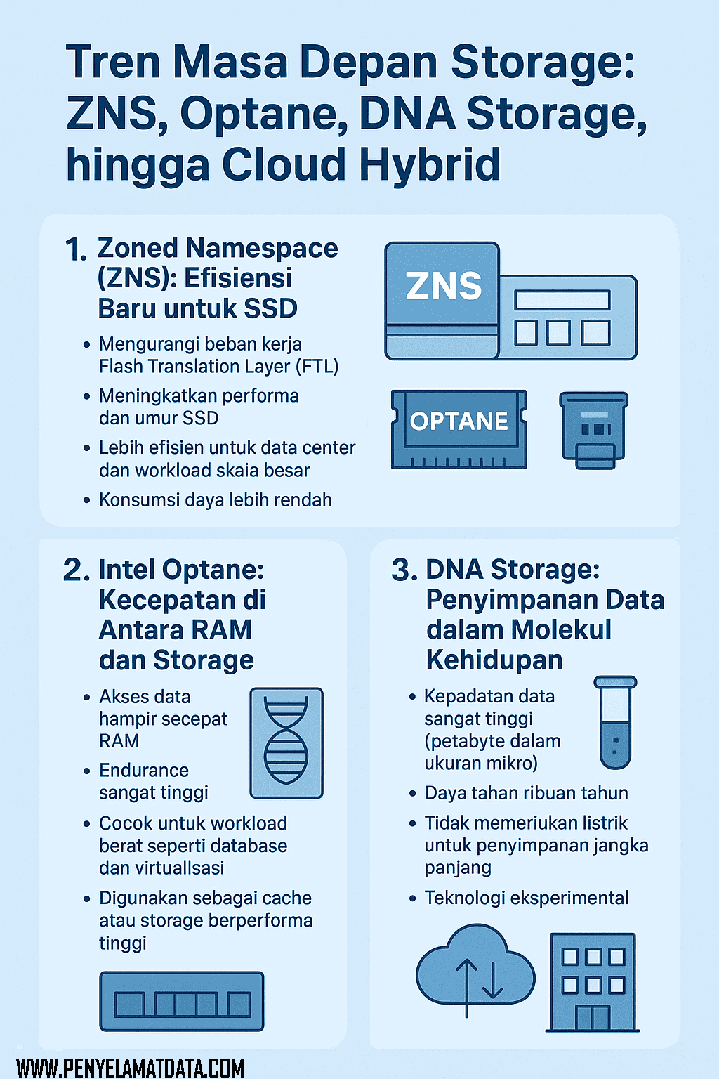ZNS, Optane, DNA Storage, dan Cloud Hybrid menunjukkan bahwa masa depan storage tidak hanya soal kapasitas, tetapi juga kecepatan, efisiensi, daya tahan, dan fleksibilitas. Inovasi ini menjadi fondasi penting dalam menghadapi ledakan data global dan transformasi digital yang semakin masif.