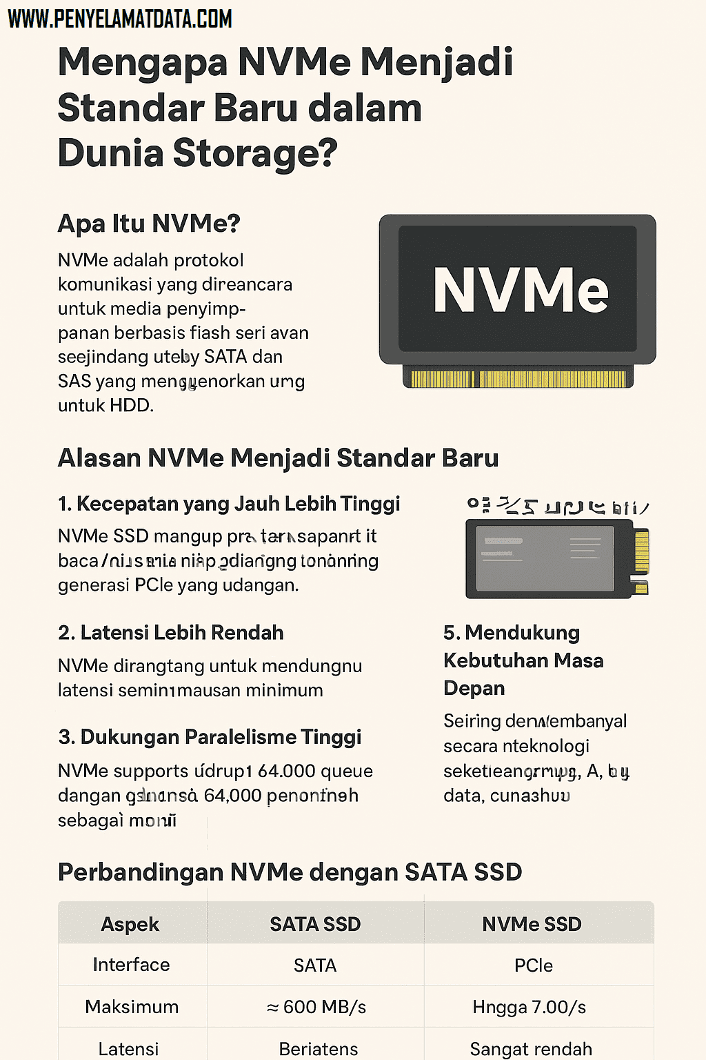 Perkembangan teknologi penyimpanan data mengalami lompatan besar dalam satu dekade terakhir. Jika sebelumnya Hard Disk Drive (HDD) dan Solid State Drive (SSD) berbasis SATA menjadi andalan, kini NVMe (Non-Volatile Memory Express) hadir sebagai standar baru dalam dunia storage. NVMe tidak hanya menawarkan kecepatan yang jauh lebih tinggi, tetapi juga efisiensi dan skalabilitas yang dibutuhkan oleh sistem modern.